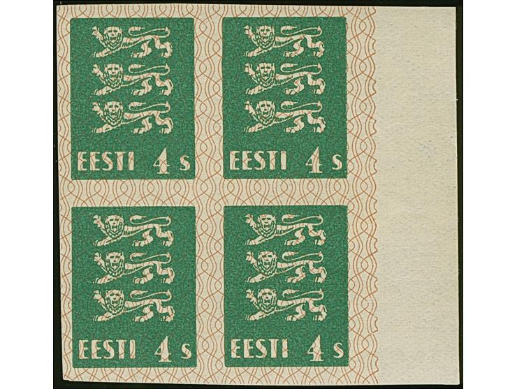 1928, Coat of Arms 4 senti green, imperforated block of four with burelage with right sheet margin, mint never hinged, very fine