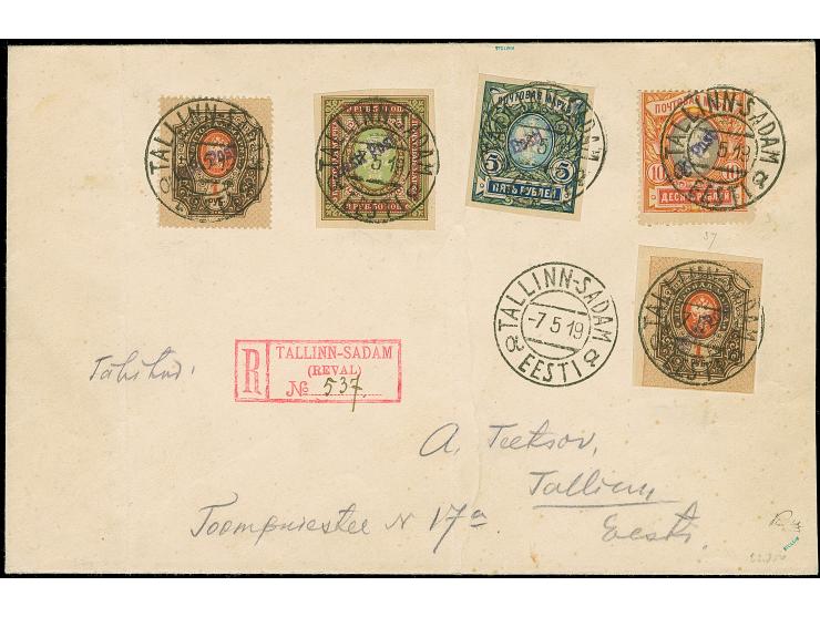 1919, 10 rubel perforated together with 3,5 and 5 rubel imperforated with additional franking tied by cds. "TALLINN-SADAM -7 5 19" to local registered cover addressed to A. Teetsov. Cover folded twice without affecting the stamps, otherwise fine. This is the only known cover with all Rubel-values, especially the 10 rubel value is extremely rare with only 11 copies printed and only one other copy known as single franking on cover. A great and very attractive rarity of Estonian Philately, signed Mikulski a.o. with his certificate (1994) and certificate Löbbering BPP (2015)