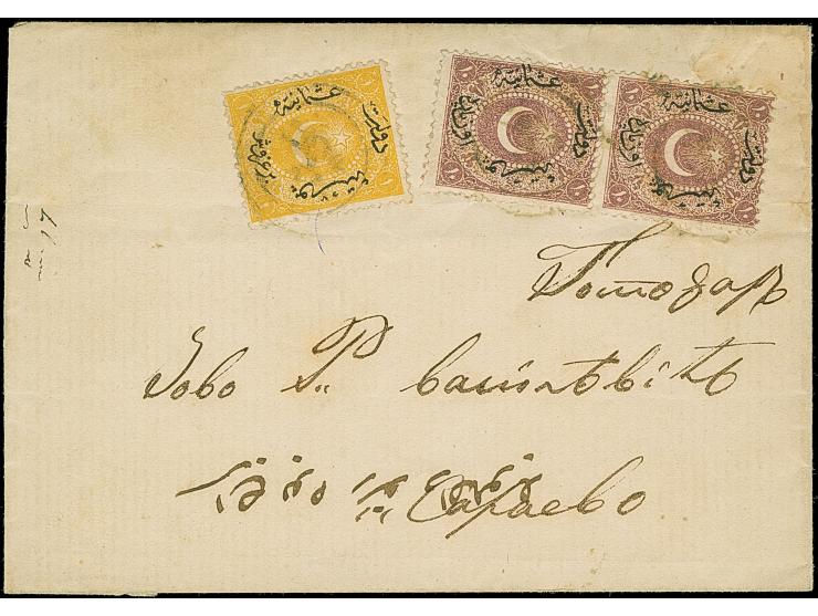 1868, Turkey issue 1868 10 pa. red-lilac, horizontal pair and 1 ghr. yellow tied by “MOSTAR” circular type cancellation in blue to entire letter to Sarajevo. The stamps with crease marks, otherwise fine