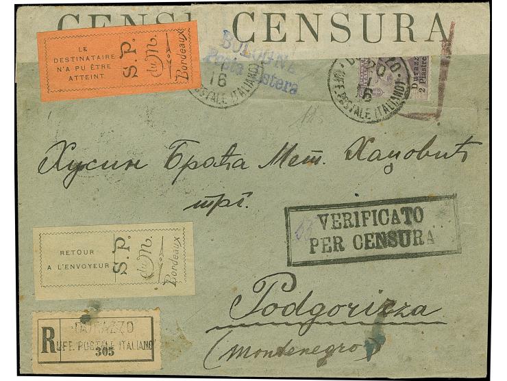 1909, Durazzo 4 pia. on 50 c. pale violet tied by cds. “DURAZZO 20.1.16” to registered cover with censor mark and labels to Podgorica, Montengro and retour with two labels in orange “..-N'A PU ÊTRE ATTEINT S.P. Bordeaux” and in green “RETOUR A L'ENVOYEUR S.P. Bordeaux”. The cover horizontal folded, otherwise fine