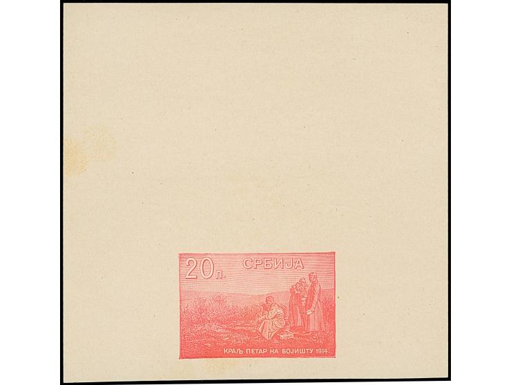 1915,King Peter & Military Staff 20 pa. rose, imperforated singel die proof on ungummed, white paper (88x85mm), fine, signed Calves