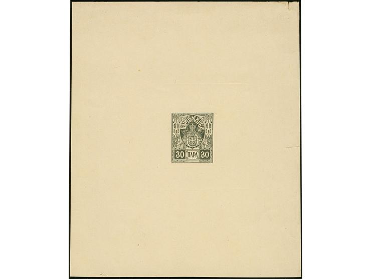 1918, Coat of Arms 30 pa. black, imperforate single die proof on glossy, ungummed paper (107x127mm), small tear at right and small corner fault at upper right, otherwise fine