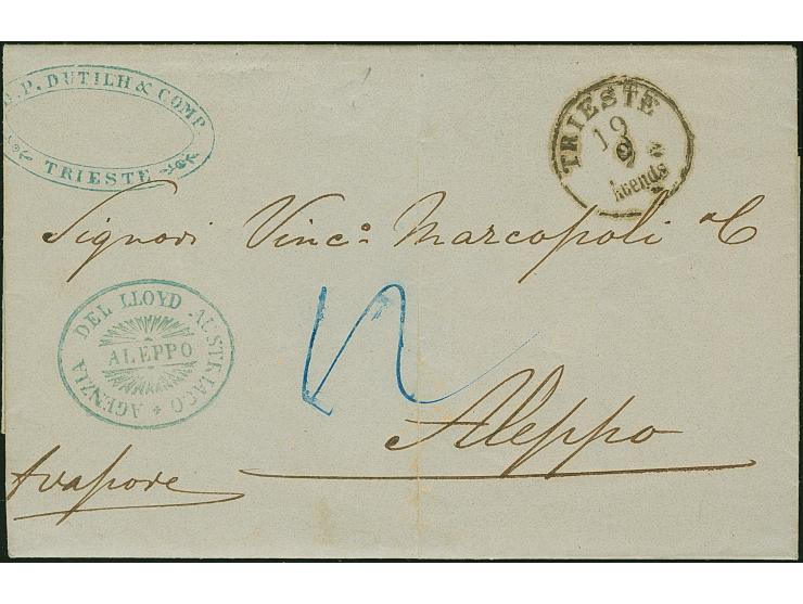 1856, unpaid entire letter with full content from "TRIESTE 19/9" to Aleppo with front side clear blue "AGENZIA DEL LLOYD AUSTRIACO ALEPPO", charged "12" Kreuzer to be paid by the receipient, usual file fold, otherwise very fine and attractive
