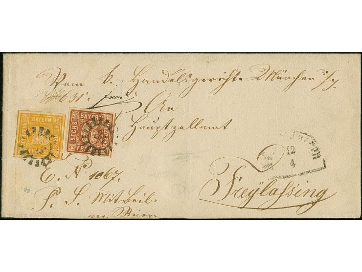 18 Kr. gelborange und 6 Kr. braun Type II, Platte 2, beide voll- bis breitrandig, teils mit Schnittlinien, mit gMR "25" und nebengesetztem Halbkreis "AU B. MÜNCHEN 12/4" (1859) auf Briefhülle der 4. Gewichtsstufe nach Freilassing. Eine äußerst seltene Inlands-Frankatur in einwandfreier Erhaltung. Fotoattest Sem BPP (2018)