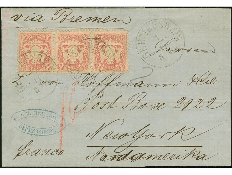 3 Kreuzer rosa im waagerechten 3er-Streifen bzw. 9 Kr. braun, je farbfrisch und gut gezähnt, auf Briefhülle bzw. Briefkuvert über Bremen in die Vereinigten Staaten. Brief mit 3 Kr. Fotoattest Schmitt BPP (2010)