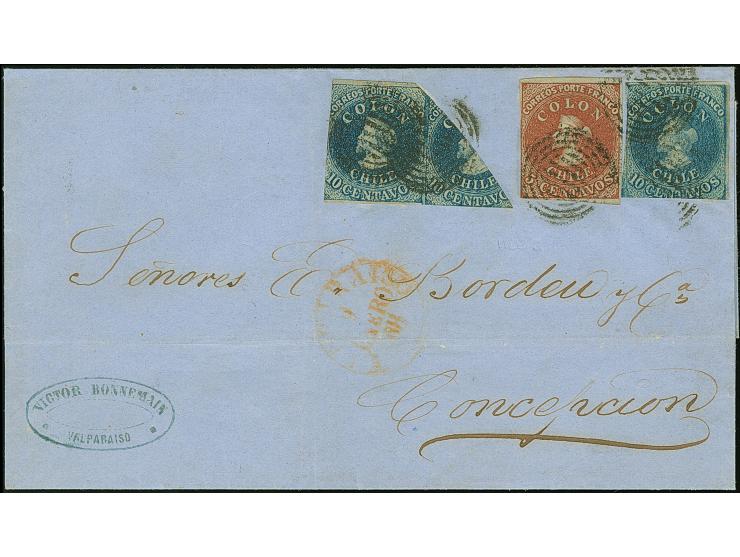 1856/65, 10 c. blue, bisect in pair with entire stamp, together with another copy 10 c. and 1855, 5 c. red-brown on bluish, tied by target to letter sheet from Valparaiso 1858 to Concepción. A fine and very scarce combination. Certificate Rendon (1988)