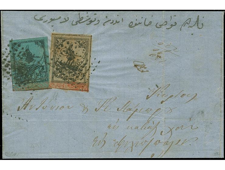 1863, Tughra, 2nd printing, 1 pia. on lilac-grey and 2 pia. on blue, both with nice margins, tied by dotted battal handstamp to entire letter to Filibe. Very fine and fresh. Signed A. Diena and Calves, opinion Todd AIEP (2013)