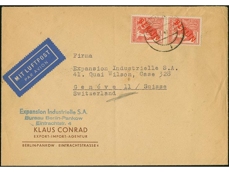 1949, Rotaufdruck 30 Pfg. im senkrechten Paar mit Stempel “BERLIN N20 8.7.49” als portogerechte Mehrfachfrankatur auf IAS-Luftpostbrief bis 20 g via Frankfurt nach Genf. Der Umschlag mit Beförderungsspuren im Rand, die Marken sind in einwandfreier Erhaltung