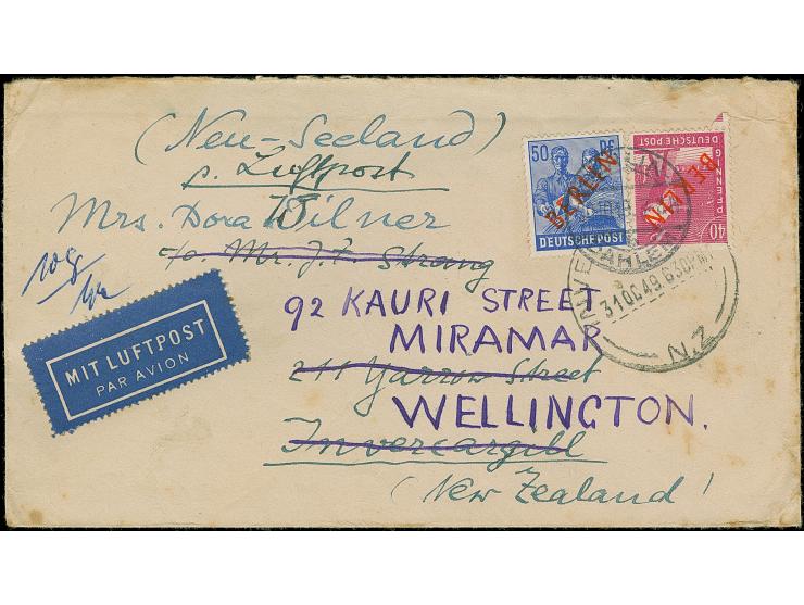 1949, Rotaufdruck50 und 40 Pfg. mit Stempel “BERLIN-DAHLEM  20.10.49” als portogerechte Frankatur auf IAS-Luftpostbrief bis 20 g via Frankfurt nach Invercargil, Neuseeland mit Ankunftsstempel vom 31.10.49 und Nachsendung nach Wellington. Der Umschlag mit Beförderungs- und Altersspuren und rückseitig fehlt die Verschlussklappe sowie 40 Pfg. mit zwei kurzen Zähnen, sonst in guter Gesamterhaltung. Trotz der Einschränkungen ein interessanter Luftpostbrief mit sehr seltener Destination Neuseeland, ProFi hat keinen weiteren IAS-Luftpostbrief mit Destination Neuseeland registriert