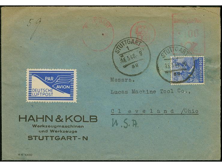 1948, Jeia-Marke ohne Poststempel auf Luftpost-Brief mit Absenderfreistempel 100 Pfg.  “STUTTGART 15.5.48 - Hahn & Kolb" und Arbeiter 50 Pfg. mit Stempel “STUTTGART 1 15.5.48” in die USA. Der Umschlag zweiseitig geöffnet mit kleinen Randfehlern rechts, sonst in guter Erhaltung. Mischfrankaturen mit Freistempeln sind recht selten