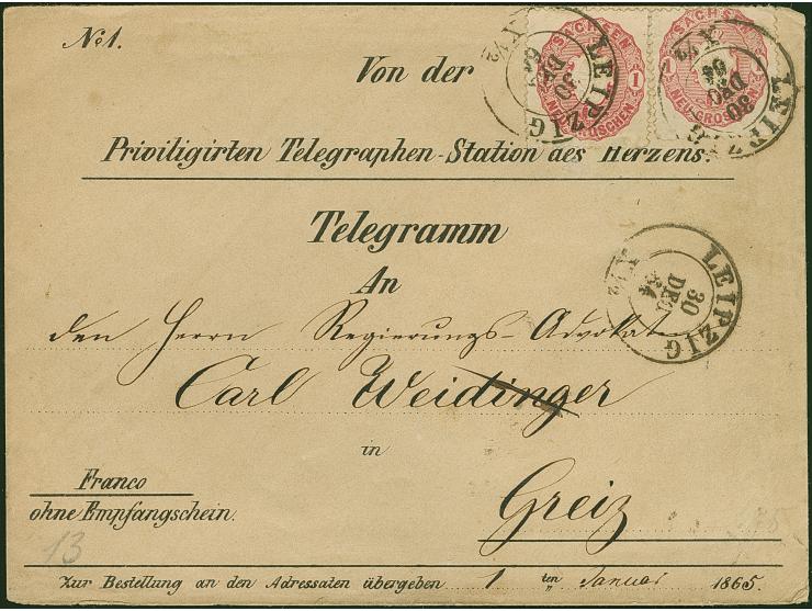 1 Ngr. rosa, 2 Einzelwerte mit DKr. Leipzig 30 DEC 64 auf dekorativem 'Telegramm' der "Priviligirten Telegraphen-Station des Herzens", nach Greiz, mit Ankunftsstempel. Die rechte Marke durch Randklebung etwas gestoßen. Ein attraktiver und ungewöhnlicher Zierbrief.