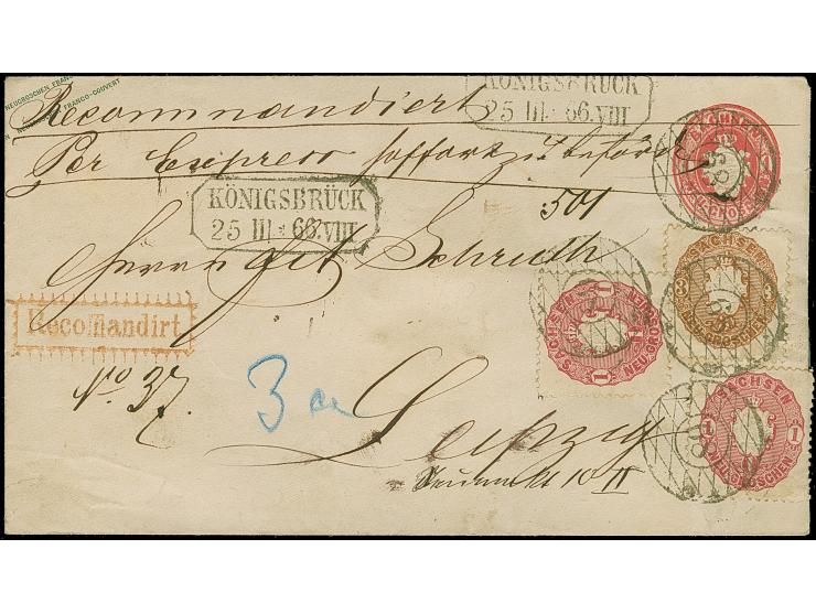 3 Ngr. braun und 2 Einzelwerte 1 Ngr. lebhaftlilarot, mit sauber aufgesetzter Nr. "68" als Zufrankatur auf Ganzsachenumschlag 1 Ngr., mit sauber nebengesetztem Ra2 "KÖNIGSBRÜCK 25 III 66" als eingeschriebener Express-Brief nach Leipzig. Eine 1 Ngr. Über den Rand der Ganzsache geklebt und hier in der Zähnung leicht bestoßen, sonst sehr schöne und frische Erhaltung.