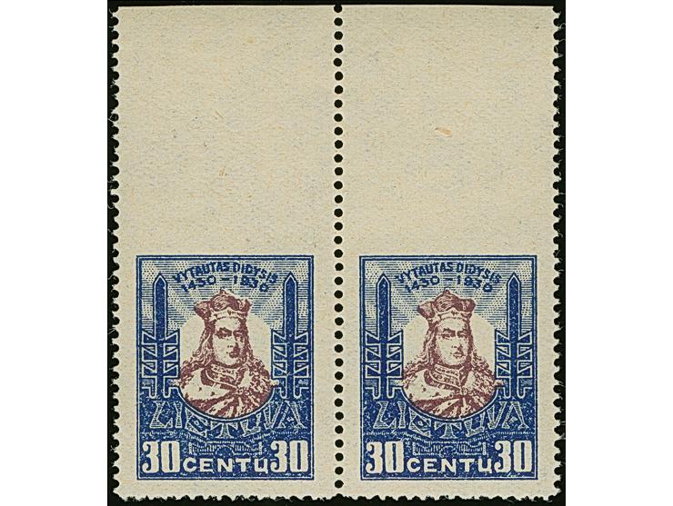 1930 Grand Duke Vytautas 30 centu, horizontal pair with upper sheet margin, imperforated at top, mint never hinged with hinge only in the outer margin, fine and attractive (PSL 229b)