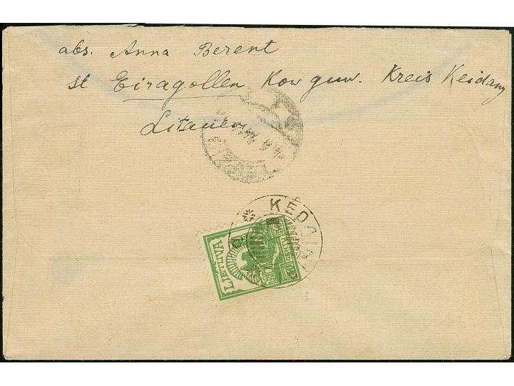 KEDAINIAI: 1921, Kaunas Castle Ruins 50 centu green, tied by cds. “KEDAINIAI 2.VI.24” to reverse of registered cover with handwritten registration label “Kedainiai N 134" to Leipzig with arrival mark, fine