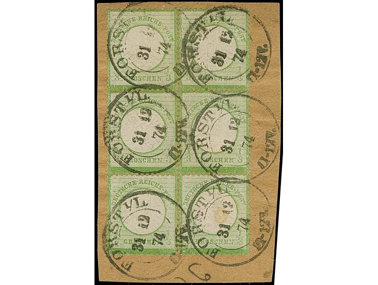 ⅓ Gr. gelblichgrün im angetrennten, senkrechten 6er-Block jeweils mit sehr klarem DKr. “FORST I/L. 31.12.74” auf Briefstück. Die farbfrischen Marken sind erkennbar geprägt, bis auf einen kurzen Zahn gut gezähnt und die rechte untere Marke hat eine leichte Tönung, ansonsten in einwandfreier Erhaltung. Eine dekorative und seltene Einheit, ProFi hat keine größere Einheit dieser Marke mit LETTZTAG-Stempel registriert, Fotoattest Krug BPP (2015)