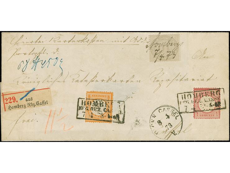10 Gr. hellgraubraun mit handschriftlicher Entwertung “Homberg 7/4.73” in Mischfrankatur mit großer Schild ½ Gr. orange und 1 Gr. karmin je mit Rahmenstempel “HOMBERG REG.BEZ.CASSEL 7.4.73” auf Paketbegleit-Briefhülle für ein 68 Pfund 450 g schweres Paket nach Kassel mit Ausgabestempel. Die Innendienstmarke rechts mit leichter Scherentrennung, die farbfrischen Brustschildmarken sind gut bis sehr gut geprägt, gut gezähnt und in einwandfreier Erhaltung