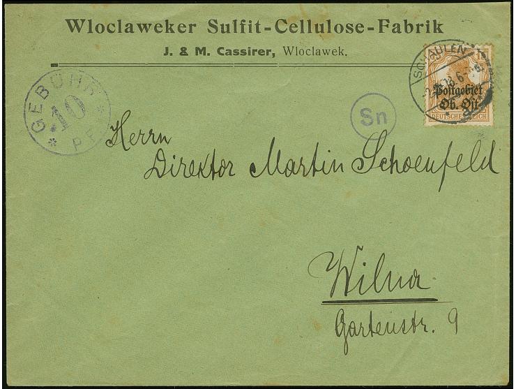 "SCHAULEN *** 2.8.18", klar auf Germania 15 Pfennig auf Bedarfsbrief mit nebengesetztem Zensur-EKr. “Sn” nach Wilna mit Gebührenstempel "GEBÜHR 10 PF." der Stadtpost, etwas fleckig, sonst in guter Erhaltung