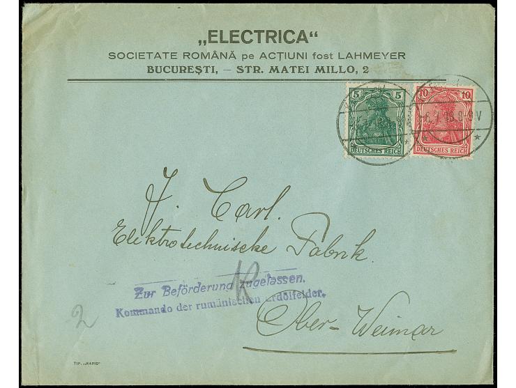 “Zur Beförderung zugelassen. Kommando der rumänischen Erdölfelder.”, violetter L2 auf Brief mit vorgedruckter Absenderangabe, frankiert mit Deutsches Reich Germania 5 und 10 Pfennig, mit Stempel “K.D. Feldpost -6.7.18” nach Ober-Weimar, leichte Beförderungsspuren, sonst gute Erhaltung