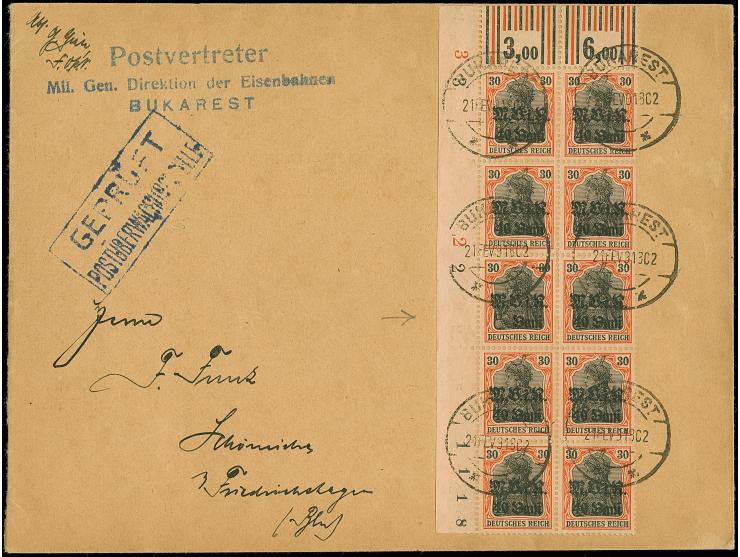 1917/18, 40 Bani auf 30 Pfennig, 10er-Block aus der linken oberen Bogenecke, die mittlere linke Marke mit Aufdruckfehler “Bani statt 40 Bani", sauber mit Stempel “BUKAREST 21 FEV 918” auf großformatigem Brief, tadellos, Fotoattets Hey BPP (2014)