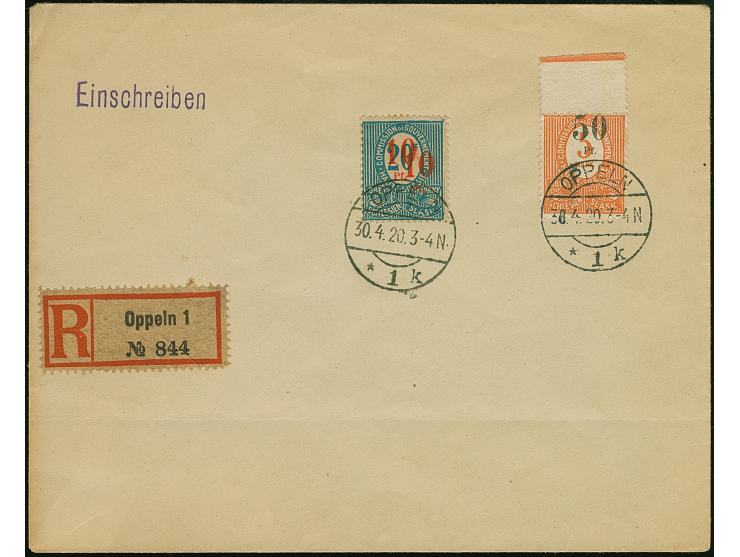 1920, 10 Pfennig auf 20 Pfennig preußischblau mit Doppelaufdruck, zusammen mit 50 Pfennig auf 5 Mark orange, Aufdrucktype IIIa, mit Stempel “OPPELN 30.4.20” (bei der 50 Pfennig der Stempel winzig nachgezogen) auf blanko Brief, die Marken tadellos, Kurzbefund Gruber BPP (2015)