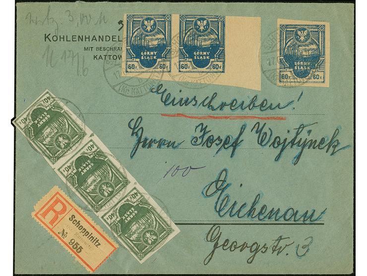 1921, Industrielandschaft 40 bzw. 60 Fenigow geschnitten, senkrechter Dreierstreifen bzw. waagerechtes Paar und Einzelwert, sauber mit Stempel “SCHOPPINITZ 17.6.21” auf R-Brief nach Cichenau, ein Wert winzig über den Rand geklebt, gute Erhaltung