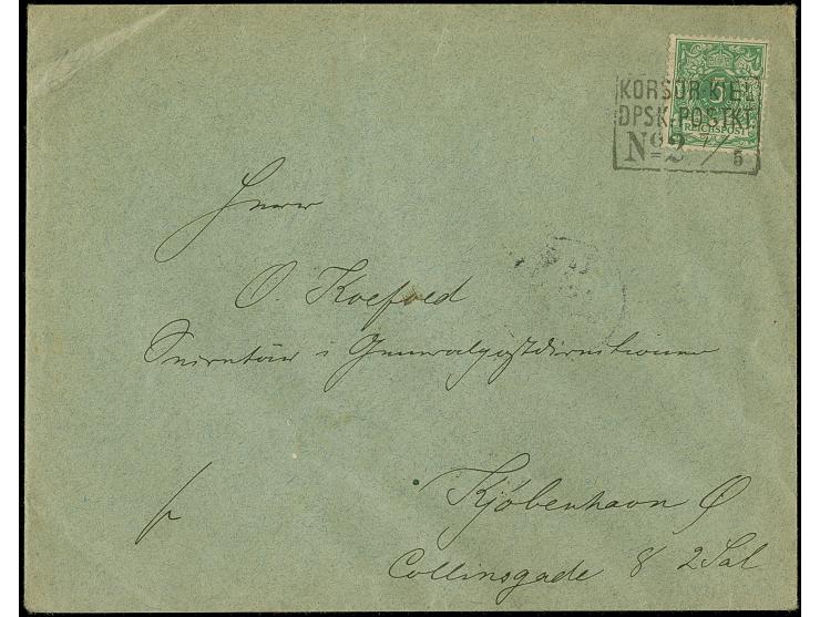 1890, Krone/Adler 5 Pfg. opalgrün mit dänischem Schiffspost-Stempel “KORSOR-KIEL DPSK-POSTKT. No.2 7/5 (97)” nach Kopenhagen mit Ankunftsstempel. Der Umschlag mit kleinen Randspuren bzw. Eckbug, ansonsten in guter Erhaltung