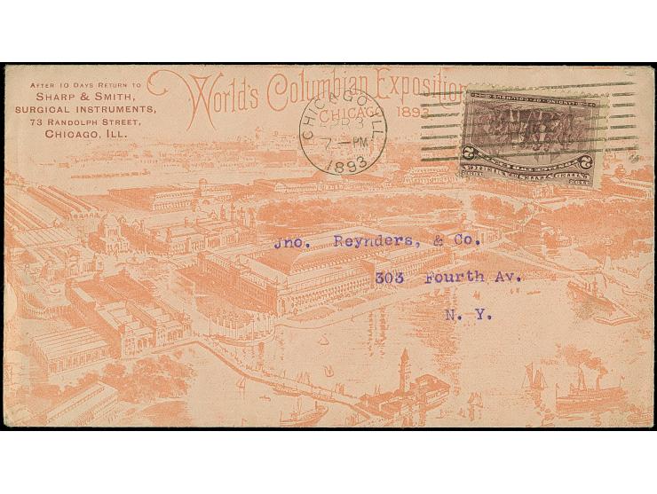 1893, Columbian Exposition 2 c. tied by machine cancel “CHICAGO ILL. APR.3.1893” to Sharp & Smith advertising cover “World's Columbian Exposition Chicago 1893” to New York with arrival mark, fine