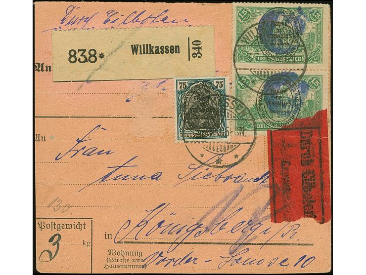 1920, Aufdruckausgabe im Hochoval 5, 20 und 75 Pfennig sowie senkrechtes Paar 1,25 Mark, vorder- bzw. rückseitig mit violettem Korkstempel bzw. Aufgabestempel “WILLKASSEN -3.7.20” auf Eil-Paketkarte nach Königsberg, 1,25 Mark gering über den Rand geklebt, winzig berieben, sonst tadellos