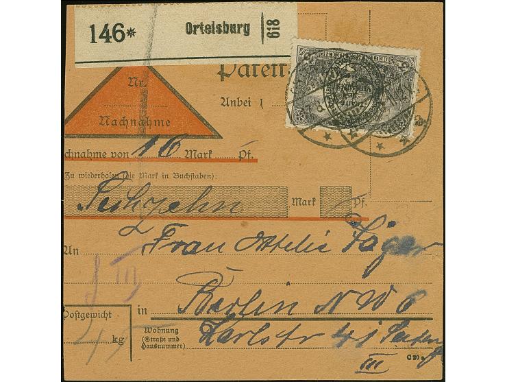 1920, Aufdruckausgabe im Hochoval 3 Mark, sauber mit Aufgabestempel “ORTELSBURG 17.8.20” auf Nachnahme-Paketkarte nach Berlin, gute Erhaltung