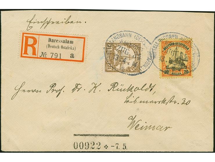“MITTELLANDBAHN (DOA) a ZUG 34 13.4.14” zweimal klar auf Kaiseryacht 2½ H. ohne Wasserzeichen und 20 H. mit Wasserzeichen als tarifgerechte Frankatur auf R-Brief mit R-Zettel “Daressalam (Deutsch-Ostafrika)” nach Weimar mit Ankunftsstempel, in einwandfreier Erhaltung