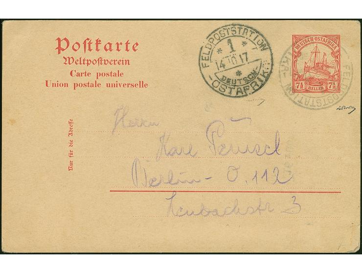 1917, “FELDPOSTSTATION DEUTSCH OSTAFRIKA 1 14.10.17” einmal etwas schwach auf Ganzsachenkarte 10 Pfg. mit nebengesetztem 2. klaren Abschlag und viel Text und Datierung “D.O.A.-Fpst. 1 13.X.17” nach Berlin. Die Karte mit Eckbügen, ansonsten in guter Erhaltung. Eine sehr späte Verwendung mit neuem Spätdatum, die Beförderung nach Deutschland erfolgte vermutlich nicht mehr, sign. E. Boden