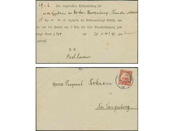 1901, Kaiseryacht 5 P. dunkelkarminrot mit EKr. “DAR-ES-SALAAM DOA 2.3.04” auf etwas beschnittenem Faltbrief vom Postamt mit Bestätigung zum Eingang einer Postanweisung und die Gebühren inkl. 5 Pesa für diese Benachrichtigung nach Neu-Langenburg. Eine ganz ungewöhnliche und seltene Verwendung