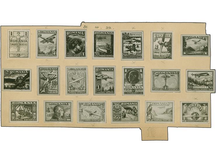 1932, Contemporary Photographs from the Printer´s Record Books: The following 20 Air Mail Essays have been removed from the printer´s daily photographic record books, many being of hand-painted essays and unaccepted designs, and mounted on card. The date stated is the entry date into the archive record book “Romania 1932 (31 Oct.)” Aviation Fund 50 b. (6), 1 l. (8), 2l. (6), all different unadopted designs, very scarce.