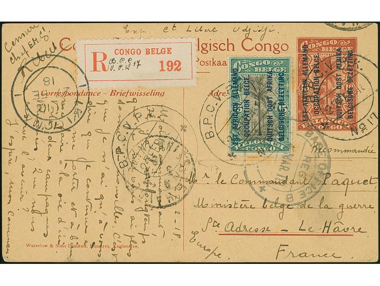 1916, Aufdruck-Ausgabe 5 C., zwei Einzelmarken mit Feldpoststempel “B.P.C.V. P. No.17 27.FEB.18” vorder- und rückseitig auf Aufdruck-Bild-Ganzsachenkarte “Kasulu” 10 C. als R-Karte mit viel Text via Kigoma nach Le Havre mit Ankunftsstempel, in guter Erhaltung