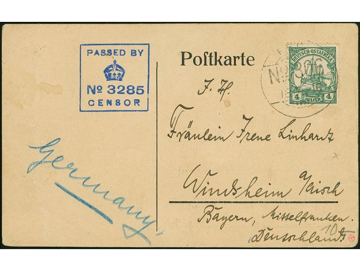 1916, “F.P.O. No. 306 18.DE.16” klar auf Kaiseryacht 4 H. mit Wasserzeichen auf Vordruckkarte eines Internierten mit rückseitigem Zurduck “Franko: Deutschland 4 H., Ausland 7½ H.” und vorderseitigem Zensurstempel “PASSED BY CENSOR No. 3285” nach Deutschland. Die Karte mit kleinen Randspuren, ansonsten in guter Erhaltung. Eine ganz ungewöhnliche und sehr seltene Verwendung