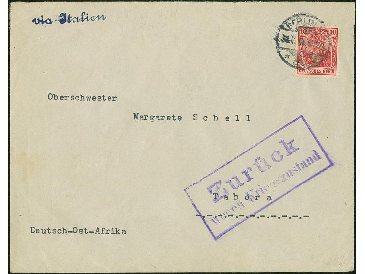 Incoming Mail: 1914, Germania 10 Pfg. mit Firmenlochung “K.d.W” (= Kaufhaus des Westen) und Stempel “BERLIN W50 31.7.14” auf Vordruckbrief mit Leitvermerk “via Italien” und Rahmenstempel “Zurück wegen Kriegszustand”, adressiert nach Tabora. Der Umschlag mit leichten Beförderungsspuren und die Marke mit Eckzahnfehler, ansonsten in guter Erhaltung
