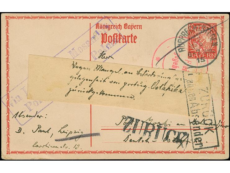 Incoming Mail: 1915, Bayern Ganzsachenkarte 10 Pfg. mit Stempel “RUPPRECHTSTEIN 30.SEP.15” mit rotem Zensurstempel von Emmerich und Leitstempel “via Lissabo-Mosambik-Porto Ameila-Palma”, adressiert nach Moschi. Dann zurück mit Klebezettel “Wegen Mangel an Beförderungs-gelegenheit von portug. Ostafrika zurückgekommen” und übergehendem Rahmenstempel “ZURÜCK an den Absender”. In Kombination mit dem Leitstempel und dem Klebezettel ein außerordentlich seltene Retour-Karte in guter Erhaltung
