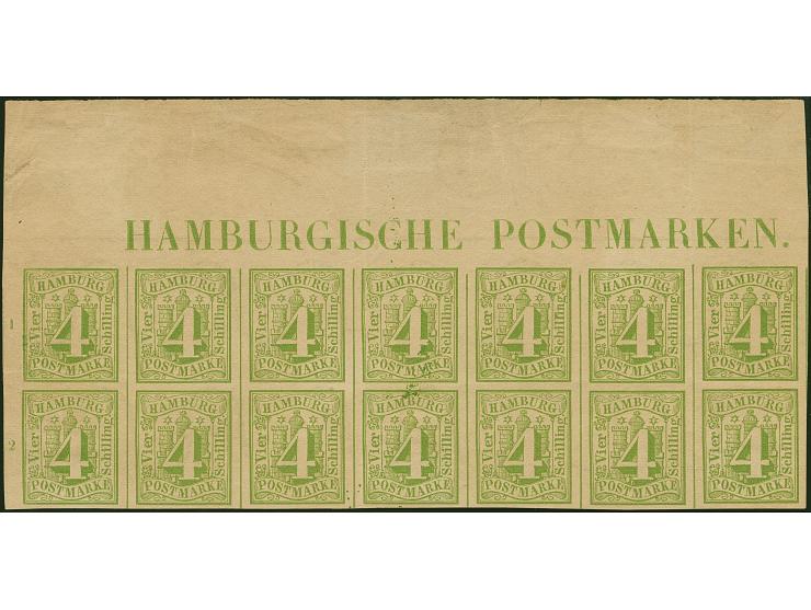 4 Sch. gelbgrün, Oberrand-14er-Block vom oberen Bogenrand, mit kompletter Randinschrift "HAMBURGISCHEPOSTMARKEN." und links Reihenzählern "1" und "2", ungebraucht ohne Gummi. Waagerechte und senkrechte Faltspuren, teils die Marken leicht berührend.