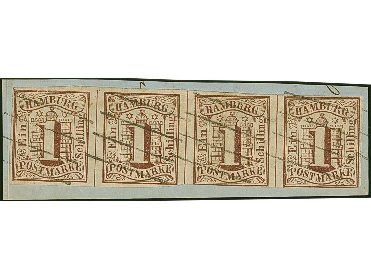 1 Sch. braun im waagerechten 4er-Streifen, Die beiden rechten Werte unten leicht berührt, sonst voll-bis breitrandig, mit jeweils sauber aufgesetztem Strichstempel auf kleinem Briefstück. Die dritte Marke von links mit senkrechtem Bug und links leichter Knitter, sonst einwandfrei. Zweitgrößte bekannte Einheit dieser Marke von der PROFI nur eine weitere registriert hat. Fotoattest Jakubek BPP (1988)