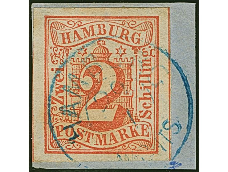 2 Sch. rot , farbfrisch und allseits breitrandig, mit sauber aufgesetztem kleinen Hannover-DKr. “HAMBURG NACHTS 29/1” auf kleinem Briefstück. Eine wohl einmalige Fremdentwertung.