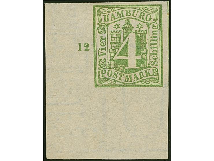 4 Sch. gelbgrün aus der linken unteren Bogenecke mit breiten Bogenrändern, Reihenzähler “12” Und großen Teil des Randwasserzeichens ‘Turm’, ungebraucht mit Originalgummi. Ein äußerst seltenes Stück.