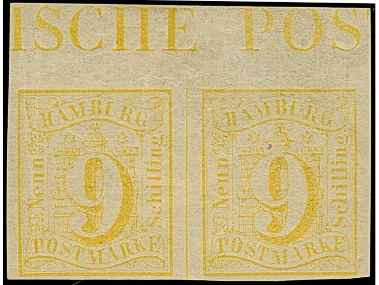 9 Sch. orangegelb, waagerechtes Paar in der typischen Farbe der frühen Auflage, voll-bis breitrandig, oben mit Bogenrand und Teil der Randinschrift “ISCHE PO”, ungebraucht mit Originalgummi. PROFI hat keine weitere Einheit dieser Marke mit Randinschrift registriert. Signiert Brandes und R.F. Engel