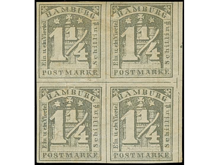 1¼ Sch. grau im 4er-Block (Typen11/12/3/4), voll- bis breitrandig, ungebraucht mit Originalgummi. Leichte Knitter, sonst einwandfrei. Eine seltene Einheit.