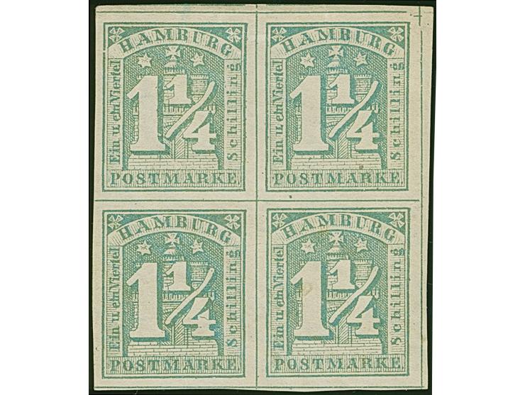 1¼ Sch. grünlichgrau im 4er-Block (Typen 3/4/7/8), farbfrisch und allseits breitrandig, ungebraucht mit Originalgummi. Rechts oben kleiner Eckbug, sonst einwandfrei. Eine sehr seltene Einheit.