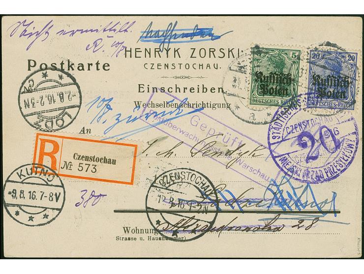 1920, Germania 5 und 20 Pfennig mit Stempel “CZENSTOCHAU 31.7.16” auf eingeschriebener Wechselbenachrichtungskarte nach Lodz, dort der Empfänger nicht zu ermitteln und retour, mit nebengesetztem Ra2 “Geprüft Postüberwachungsstelle Warschau” sowie bei Ankunft großer Stadtpoststempel “STÄDTISCHES BESTELLAMT CZENSTOCHAU 20 ", tadellos, sign. Petriuk