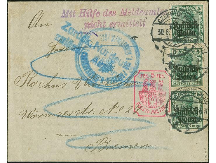 1920, Germania 5 Pfennig, senkreches Paar und Einzelwert, mit Stempel “CZENSTOCHAU 30.6.16” auf Briefkuvert nach Bremen, in Posen L2 “Zurück. Nur deutsche Sprache zulässig. Auslandsstelle Posen” versehen und retour gesandt, dann rückseitig mit großem Stadtpoststempel “STÄDTISCHES BESTELLAMT CZENSTOCHAU" sowie vorderseitig rotem Rahmenstempel “FEN. 5 FEN POCZTA MIEJSKA”, L2 “Mit Hilfe des Meldeamtes nicht zu ermitteln”, übliche Beförderungsspuren, gute Erhaltung, sign. Petriuk
