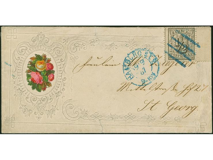 ½ Sch. schwarz, rechtes Randstück mit Reihenzähler “7”, mit sauber aufgesetztem Strichstempel und nebengesetztem DKr. “HAMBURG ST.P. 19/9 67” auf Damen-Kuvert mit aufwändiger Silber-Prägung und in einer Kartusche aufgeklebtem Blumenbouquet aus Glanzpapier. Die rechte untere Ecke des Kuverts ergänzt, leichte Lagerungsspuren und kleine Einrisse im Rand, insgesamt sehr attraktiv. Sicherlich einer der beeindruckendsten Zierbriefe von Hamburg.