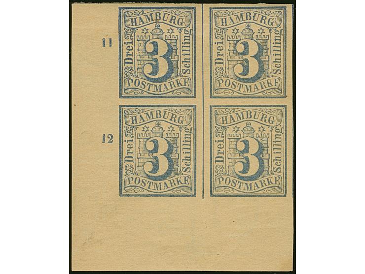 3 Sch. ultramarin, ungezähnt, im 4er-Block aus der linken unteren Bogenecke mit Reihenzählern “11” und “12” und großem Teil des Wasserzeichen 'Turm' in den beiden linken Werte und dem Bogenrand, ungebraucht mit Originalgummi. In dieser Form eine sehr seltene Einheit.