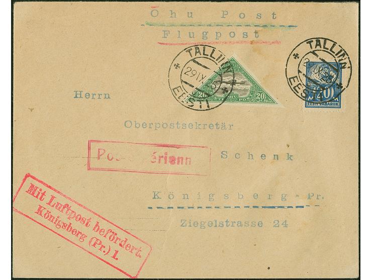 Airmail 20 marka, imperfortated, with additional franking tied by cds. "TALLIN 29 IX 25" to Königsberg, scarce last flight, fine