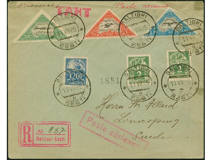 Airmail 10-20 marka, with additional franking, tied by cds. "BALTISKI 11 VII 25" to registered airmail printed-matter to Sweden, 10 marka with plate flaw "white spot in frame", few minor spots in the corners of the cover, otherwise fine